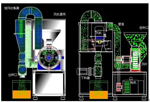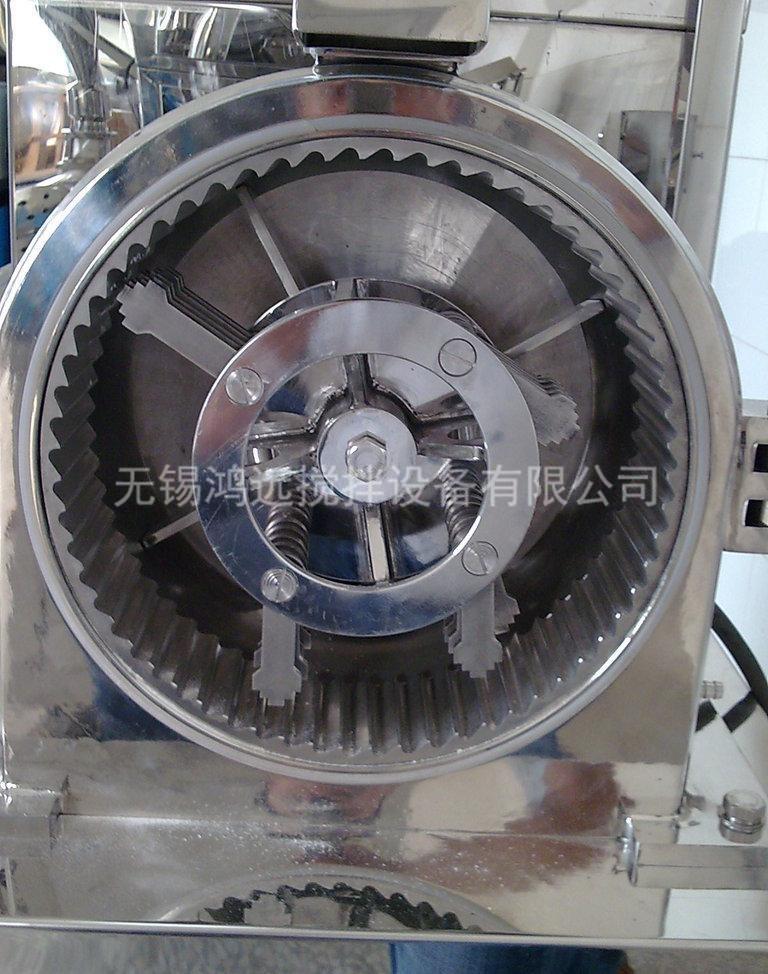 該機由加料斗,分級輪,粉碎刀片,齒圈,粉碎電機,出料口,風葉,集料箱,吸塵箱等部分組成,物料由加料斗進入粉碎室,通過高速旋轉的刀片進行粉碎,調節分級輪與分級盤的距離來達到所要求的物料細度,高速旋轉的風葉把達到要求的物料從粉碎室引到集料箱布袋中,沒有達到要求的物料繼續在粉碎室中粉碎,集料箱布袋產生的粉塵由吸塵箱收集,該機組按“GMP”標準設計,結構簡單,操作清理方便,噪音小,產量高,機器采用不銹鋼材料制作,粉碎過程中無粉塵飛揚。